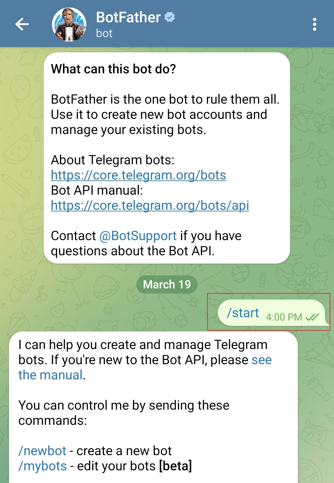Start a chat with BotFather by clicking on it and then clicking the "Start" button.