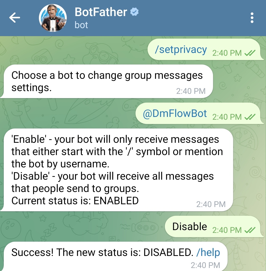 If you want to receive all messages in a group, you can follow these steps. By default, only messages starting with the command "/" are received.