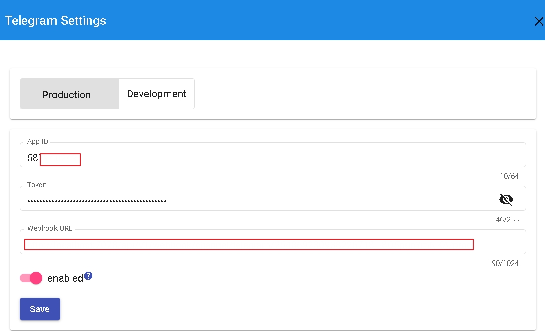 To configure your Telegram integration in the DmFlow system, select your bot, go to Settings -> Third-Party Integrations -> Telegram. Enter the numeric portion of the token before the colon (:) in the APP_ID field, and enter the complete token "58XXXXXXXX:AAEXXXXXXXXXXEBXXXXXXX" in the token field. Select "Enable" and save. The system will verify if the provided information is correct.