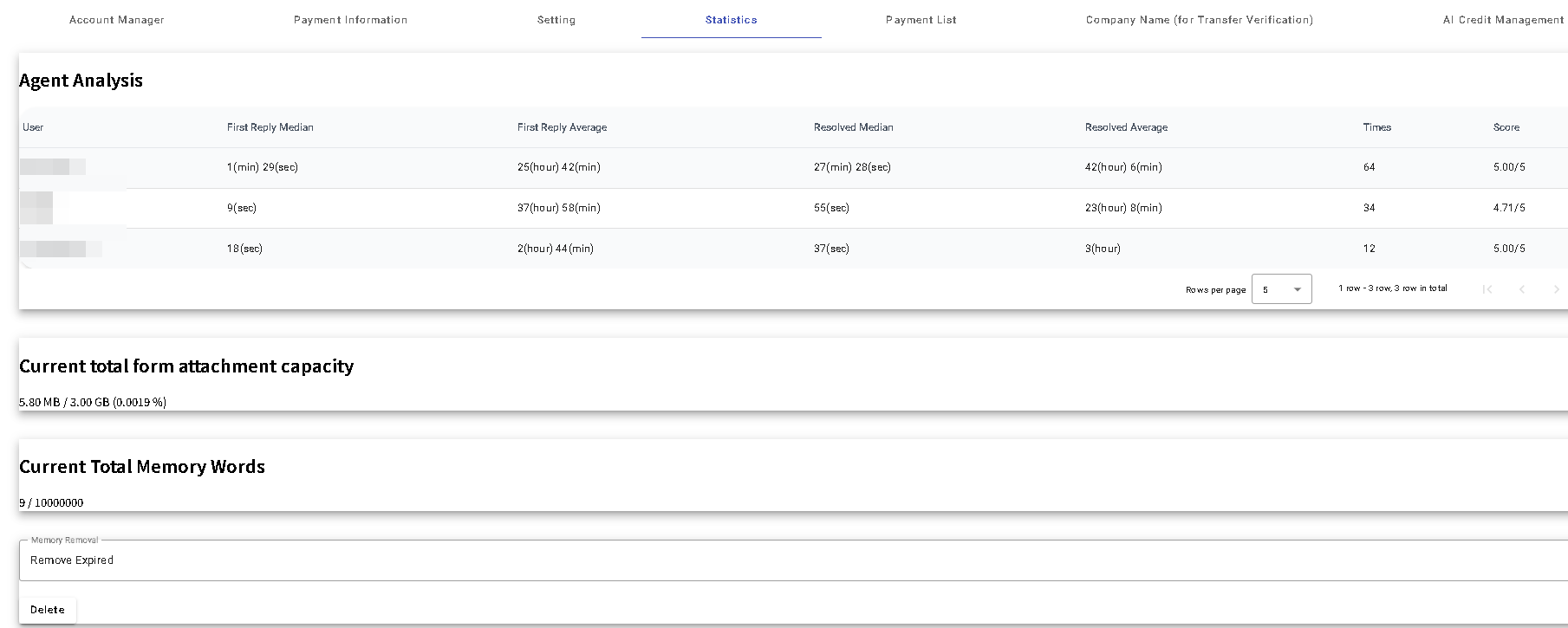 * Statistics allows you to view agent statistics, current attachment usage, total memory character count (you can clear some expired memories here), message statistics, credit statistics (AI credit usage), and session usage count.
